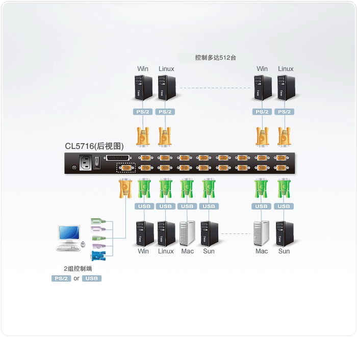 菊式串接另外31臺設備 - 單一控制端可管理高達512臺服務器(兼容的KVM多電腦切換器包括ACS1208A、ACS1216A、CS1708A、CS1716A)